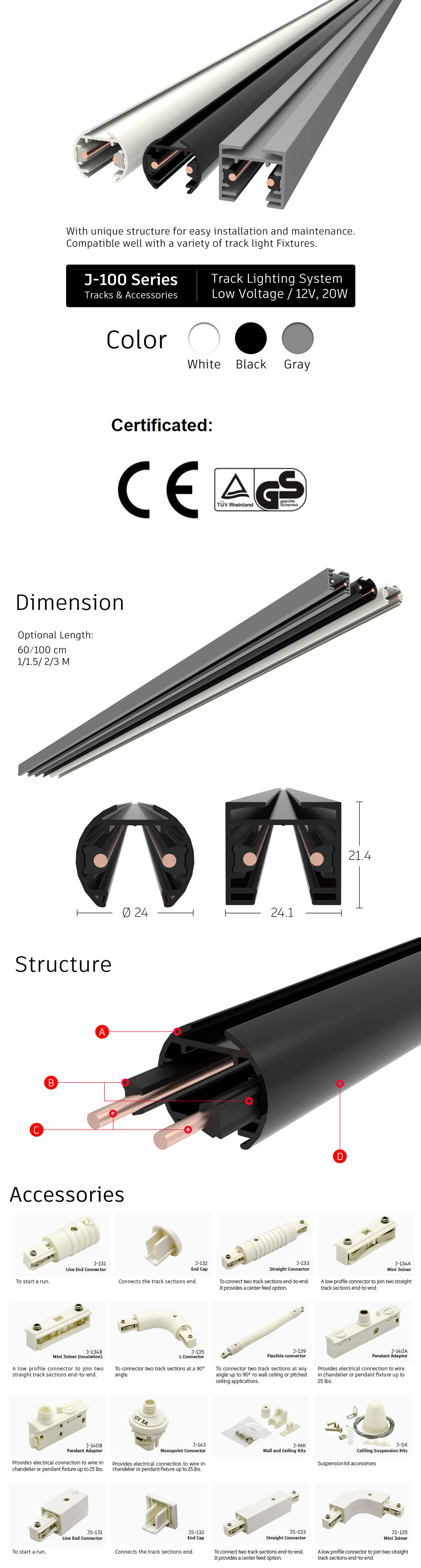 J-100 series LED light rails are excellent for 2-wire 1-circuit track rail lighting systems to install lighting fixtures and provide power. The track rail body was made of premium extruded alum-alloy profile, comes with 2 pieces of copper conducting strips, which are insulated by flame-retarded PVC material. This track rail is compatible with several types of connectors and accessories for versatile lighting layouts and designs.